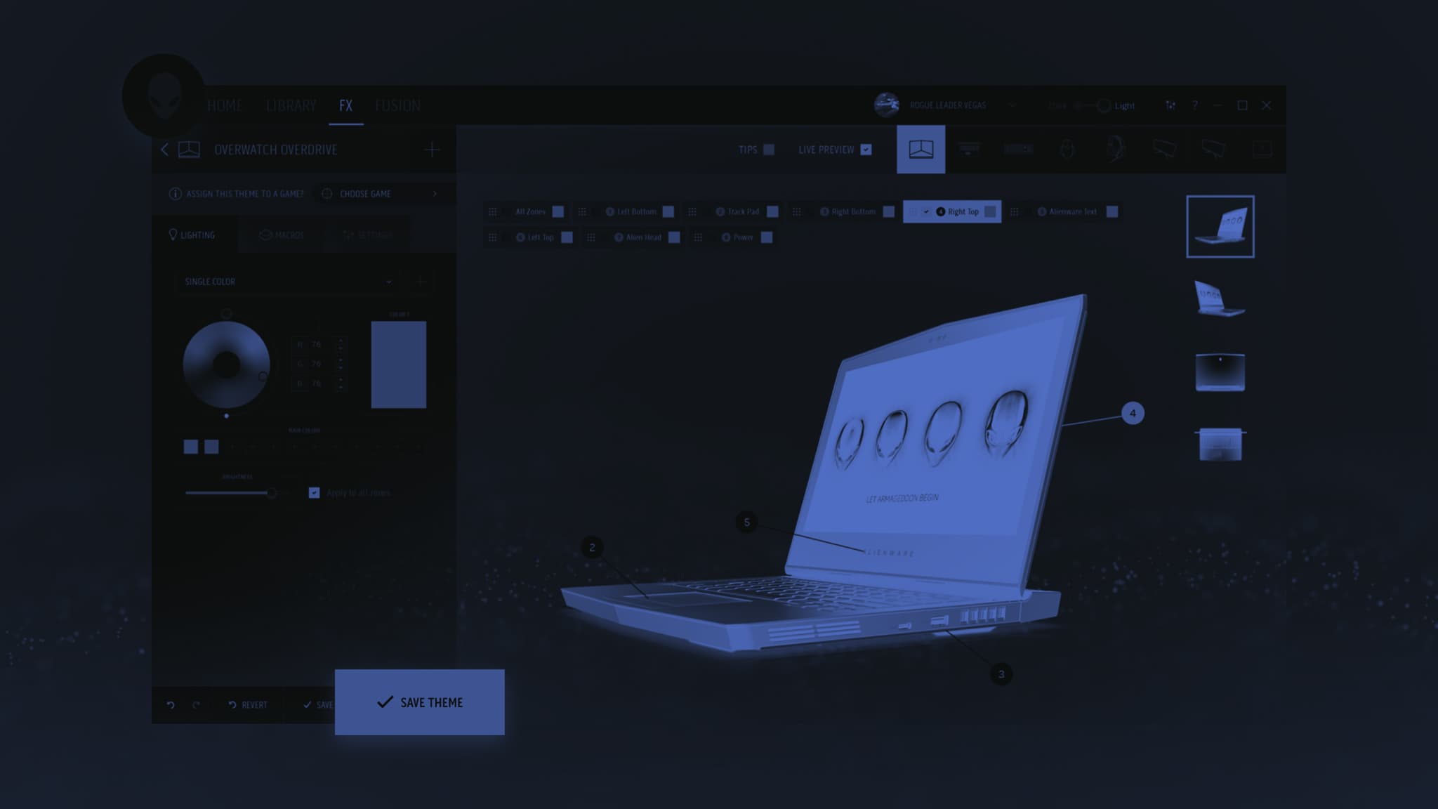 The visuals were heavily influenced by the updated industrial design of the Alienware products. Sharp edges, sci-fi inspired colors, and a heavy use of light and shadows to direct the users attention to key elements.
